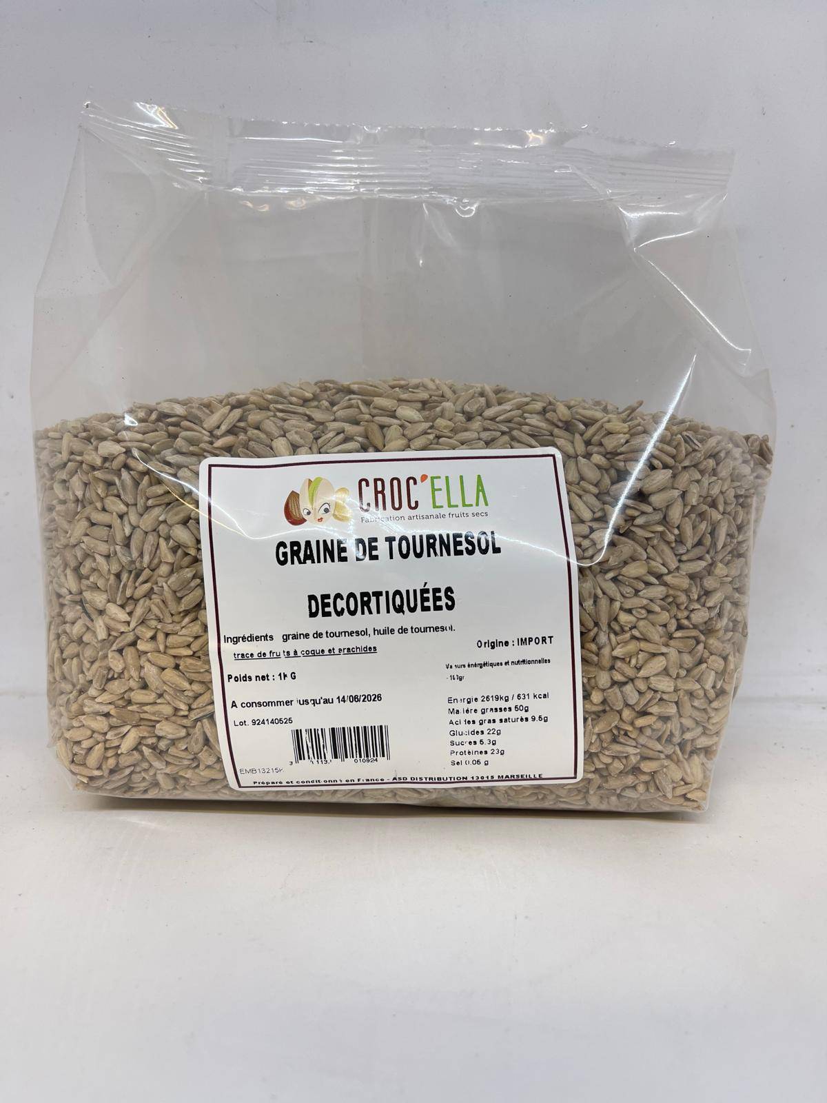 Les graines de tournesol sont les fruits de la plante, ce sont des akènes surmontés par deux écailles en arête. Leurs écales sont gris foncé, souvent striées de blanc, et à l'intérieur se cachent les petites graines de forme allongée et de couleur beige, produit en vente ici.